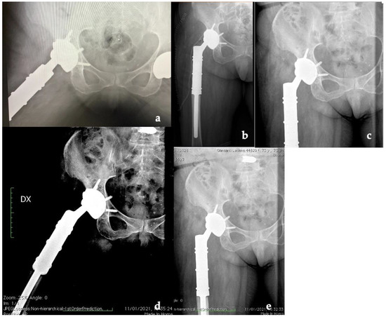 For the femoral reconstruction, a modular femoral body of 120 mm (three extension pieces of 30 mm, 40 mm, and 5 mm) with an intramedullary cementless stem extension of 13 × 120 mm (MUTARS®, Implantcast GmbH, Bextehude, Germany) was used. A cementless highly porous revision acetabular component (Delta Multihole TT, Lima Corporate, Villanova San Daniele, Italy), stabilized with four self-tapping screws (6.5 mm diameter × 20 mm length), was used for the acetabular reconstruction with a dual-mobility liner. A Trevira mesh (Implantcast GmbH, Bextehude, Germany) was wrapped around the prosthesis to reattach the soft tissues and reduce the dislocation risk.