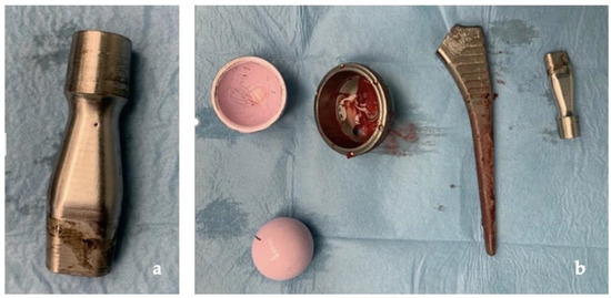 (a) Clear signs of tribocorrosion at the neck–stem junction; (b) prosthetic components removed.