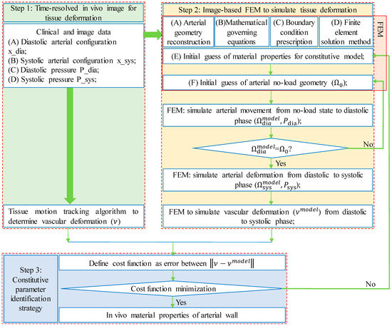 The in vivo quantification of mechanical properties of arterial tissues based on in vivo medical images is intrinsically an inverse problem [27,28]. The steps of the FEMBUA to solve the inverse problem are outlined below (Figure 1):
