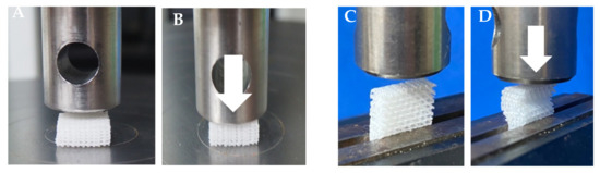 The compression forces (indicated by arrows) were applied to the superior aspect (A,B) and the lateral aspect (C,D) of the scaffolds.