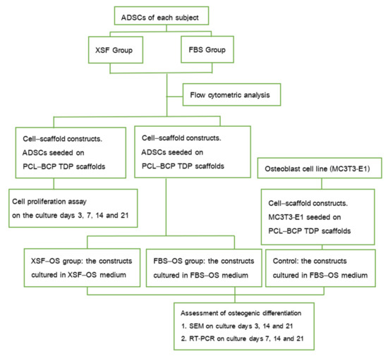 - Control group: The osteoblasts (MC3T3-E1 cell line, subclone 4, ATCC, Manassas, VA, USA) were seeded onto the scaffolds using the same ADSC protocol and cultured in the FBS–OS medium.