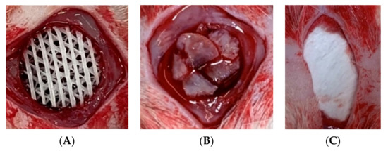 The pictures demonstrate the surgical sites of Group A (A) and Group C (B). The defects were covered with collagen membrane before suturing (C).