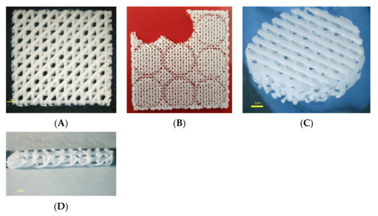 The architecture of the PCL–BCP TDP scaffold; (A) top view, (B) the scaffold was cut into round-shaped specimens for the experiments, (C) magnified picture of the scaffold specimen and (D) magnified picture of the lateral aspect of the scaffold. The scale bars represent 1 mm.
