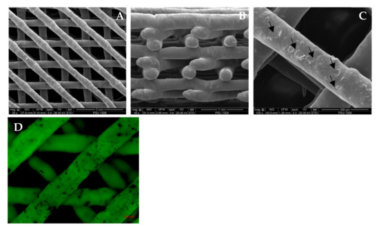 The SEM pictures demonstrate the architectures of the PCL–BCP TDP scaffolds. (A) top view, (B) lateral view and (C): image shows the BCP particles depositing on the surfaces of the scaffold (arrows). (D): The AR-stained BCP particles are seen as black spots throughout the surfaces of the scaffolds in the fluorescent microscope image.