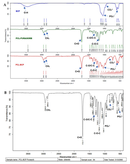 FTIR spectra for BCP, PCL and PCL-30%BCP composite. (A) The bands of the PCL–BCP composite showed no change when compared with the peaks of BCP and PCL raw materials. (B) The bands of the PCL-BCP composite were not changed when compared to those of each material.