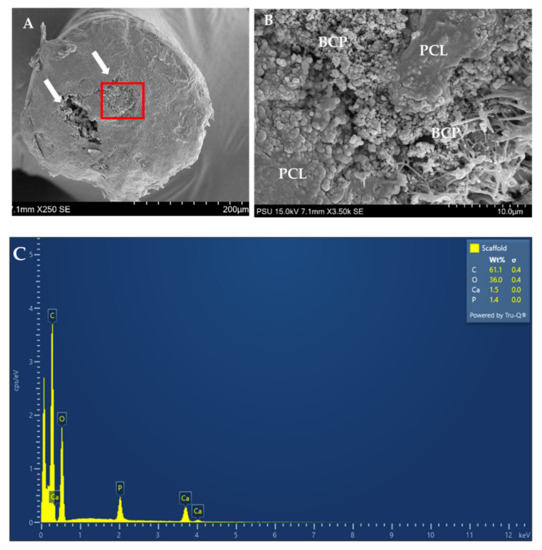 (A) The cross-sectional SEM image shows large voids inside the scaffold filament (indicated by arrows). (B) The magnified image of the box demonstrates immiscible blending of the BCP crystals and the PCL matrix in the box. (C) EDX analysis shows the high peaks of calcium (Ca) and phosphate (P) on the scaffold surfaces.