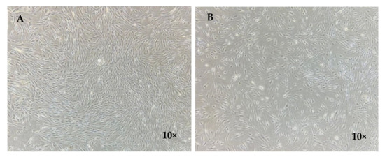 Morphologies of the adherent cells at day 21 taken via a phase-contrast microscope (DS-Fi2-U3, Nikon, Tokyo, Japan) with magnification 10×. (A) XSF group and (B) FBS group. More spindle-shaped morphologies and higher density of the cells in the XSF group were detected compared with those in the FBS group.