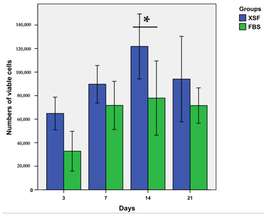 The bar graph shows the numbers of viable cells in the constructs in the XSF and FBS groups over 21 days. The growth of the cells in the XSF group was higher than that of the cells in the FBS group at all time points. The significant difference was detected at day 14 (* p < 0.05).