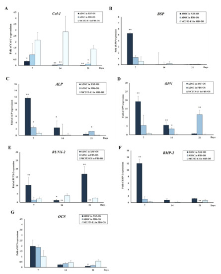 The fold change of gene expression of the cells in the constructs over 21 days; (A) Col-1, (B) BSP, (C) ALP, (D) OPN, (E) RUNX-2, (F) BMP-2 and (G) OCN. On day 7, the levels of the osteogenic differentiation genes in the XSF–OS group, with the exception of Col-1, were notably higher than those in the FBS–OS and control groups. The genes significantly downregulated on day 14. The significant differences were at p < 0.05 (*) and p < 0.01 (**), compared with the control group.