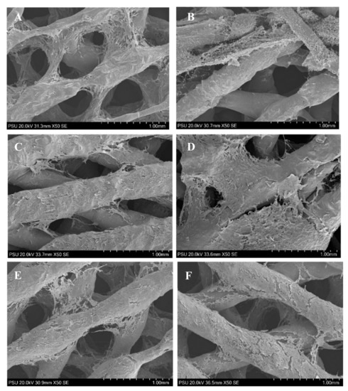 The SEM images of the cell–scaffold constructs in the XSF–OS group (A,C,E) and the FBS–OS group (B,D,F) at culture days 3 (A,B), 14 (C,D) and 21 (E,F). The cells in both groups attached and grew well on the scaffold surfaces. Dense multilayer cell sheets were observed throughout the scaffolds from day 14 and the morphologies of the cells were difficult to identify.