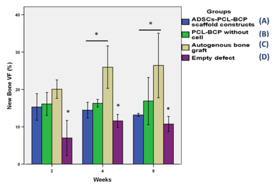 The bar graph demonstrates the new bone VFs for all groups. The new bone VFs in Group C were greater than those in the other groups, whereas those in Group D were less than the other groups over the observation period (*, p < 0.05 against group C). From week 4, the new bone volumes in Group C were significantly greater than those in Group A (*, p < 0.05). The new bone formation in Group A was less than that in Group B at all time points (p > 0.05).