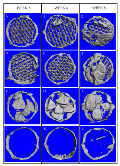 The µ-CT-constructed images demonstrate new bone formation within the defects; (A–C): Group A, (D–F): Group B, (G–I): Group C, and (J–L): Group D. The new bone formation in Groups A–C was clearly greater than in Group D. At week 8, the newly formed bone in Group A–C almost filled the entire roof of the defects, whereas in Group D, some new bone foci were detected in the middle part of the defects.