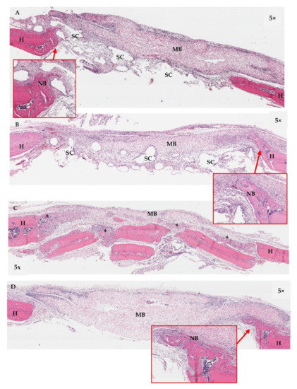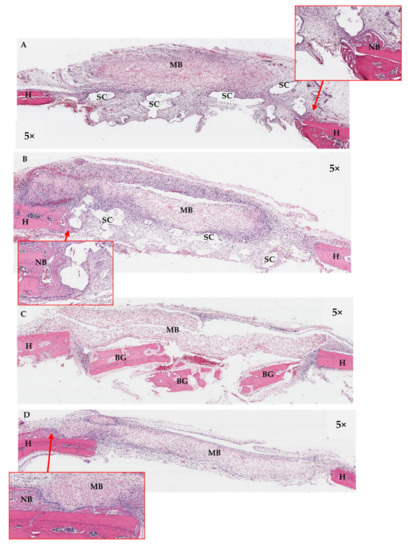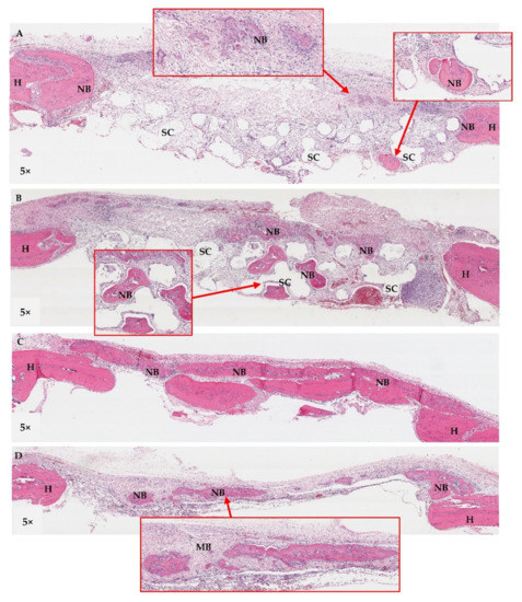 Histological features of the calvarial defects at week 2; (A): Group A, (B): Group B, (C): Group C, and (D): Group D. In Groups A and B, the scaffolds and the covering collagen membranes were surrounded by dense fibrous tissue and chronic inflammatory cells. New bone regeneration was detected extending from the periphery host bone (see boxes). In Group C, bone graft fragments were observed along the defect, which had less inflammatory cell infiltration. In Group D, newly formed bone was detected at the margins of the host bone. H = host bone, NB = new bone, SC = scaffold, MB = the collagen membranes, BG = bone graft.