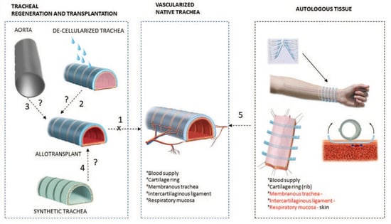 The primary trachea and its alternatives. (1) Trachea allotransplant; (2) Trachea with enzyme-free cells; (3) Aortic allograft; (4) Synthetic tube; (5) Autologous tissue. Figure modified from reference [7], with permission from Wolters Kluwer Health (License Number 501730685), 2020.