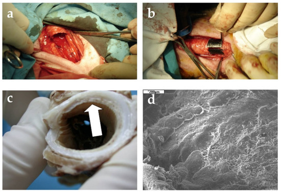 (a) Resection of tracheal segment consisting of four rings; (b) Reconstruction of tracheal defect with cylindrical implant; (c) Tissues covering outer surface of the implant at the anastomosis site; (d) Tissues covering inner surface of the implant. Figure modified from reference [8], with permission from Wojciech Ścierski, Copyright © 2018 Wojciech Ścierski.