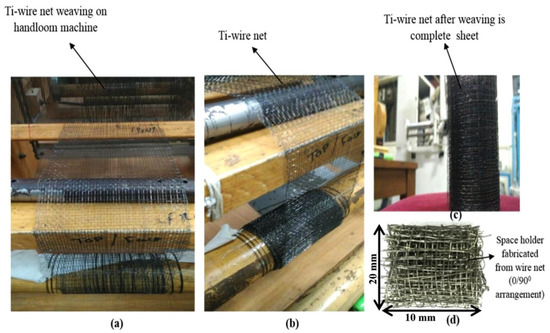 Ti-wire sheet fabrication from handloom machine: (a) weaving of Ti-wire net over handloom; (b) side image of (a); (c) Image after titanium mesh weaving; (d) space bracket after titanium mesh weaving. Figure modified from reference [67], with permission from Elsevier (License Number 5337841389847), 2019.