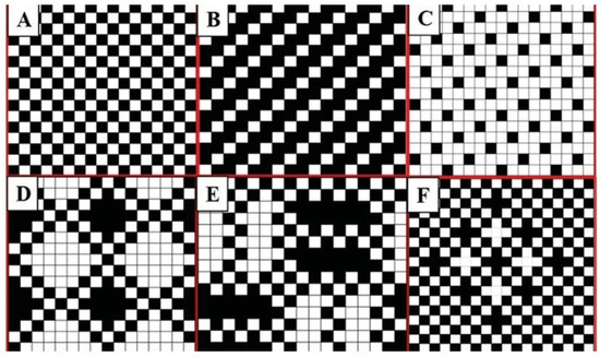 Different kinds of woven structures. (A) plain weave, (B) twill weave, (C) satin weave, (D) honeycomb weave, € fancy cord weave, and (F) fancy mesh. The black point means that the warp yarn is over the weft yarn, and the white point means that the weft yarn is over the warp yarn. Figure modified from reference [71], with permission from Elsevier (License Number 1242110-1), 2020.