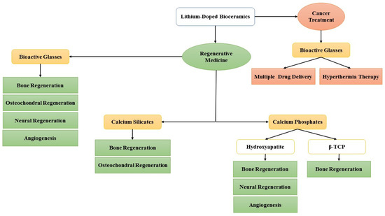Bioceramics can be used in both hard and soft tissue regeneration. The three main groups of bioceramics that incorporate Li-ions in their structure include bioactive glass (BG), calcium phosphates (including hydroxyapatite (HA) and beta-three calcium phosphate (β-TCP)), and silicates.