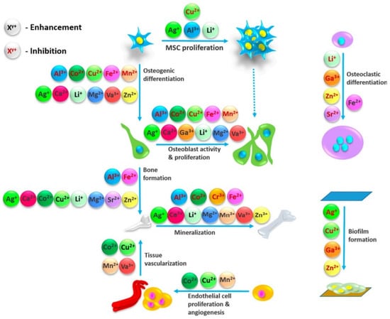 Influence of metal ions on the variety of processes involved in bone regeneration. Reproduced from [145] with permission (open access, Attribution 4.0 International (CC BY 4.0)).