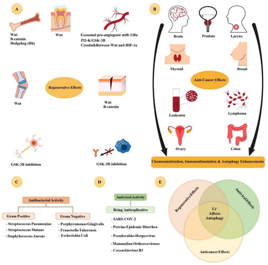 An overview of the biological effects of lithium. (A) Regenerative effects and their main signaling pathways that are activated in each tissue. Lithium can cause regeneration in several tissues, including bone, cartilage, dentin, nerve, skin, and vascular system. A WNT/β-catenin signaling pathway is the primary signaling pathway activated by lithium. Additionally, it has an anti-inflammatory response by inhibiting the GSK-3β pathway. (B) The anticancer effects of lithium in several types of prevalent cancers with a high mortality rate, including pancreatic cancer, thyroid cancer, esophageal cancer, colon cancer, prostate cancer, ovarian cancer, breast cancer, lung cancer, leukemia, and glioblastoma. Lithium has shown an anticancer effect and has been used as a singular or adjunct treatment. Hence, lithium can be considered a chemosensitizer in chemotherapy. (C) Antibacterial properties. Lithium has antibacterial properties against both Gram-positive and Gram-negative bacteria. (D) Lithium has antireplicative effects against several types of viruses. (E) The crucial point of the biological properties of lithium, including its antiviral, anticancer, and regenerative effects, is the effect of lithium on autophagy.