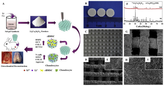(A) Schematic illustration of the application of Li2Ca4Si4O13 scaffolds for osteochondral reconstruction. Pure-phase Li2Ca4Si4O13 powders were successfully synthesized by the sol–gel method. Three-dimensional-printed Li2Ca4Si4O13 scaffolds not only promoted cartilage maturation, but also stimulated osteogenic differentiation in vitro. On the other hand, Li2Ca4Si4O13 scaffolds significantly accelerated cartilage regeneration as well as promoting subchondral bone reconstruction in vivo. (B–I) Surface morphology and XRD analysis of Li2Ca4Si4O13 scaffolds. Digital photograph (B), optical microscope image (C), and SEM images (D,E) of 3D-printed Li2Ca4Si4O13 scaffolds. The prepared porous Li2Ca4Si4O13 scaffolds possessed a controlled pore size (~250 μm). XRD analysis (F) of Li2Ca4Si4O13 scaffolds before/after soaking in the simulated body fluids for 14 days, and SEM images (G–I) of Li2Ca4Si4O13 scaffolds after soaking in the simulated body fluids for 14 days. Li2Ca4Si4O13 scaffolds induced distinct apatite mineralization on their surface. Reproduced from [258] with permission.