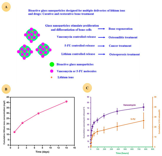 (A) Bioactive glass nanoparticles designed for multiple deliveries of lithium ions and drugs as curative and restorative bone treatment. (B) The cumulative concentration of released lithium ions shown against the soaking time. (C) The cumulative percentage of vancomycin and 5-FU released form glass nanoparticles against time. Reproduced from [263] with permission.