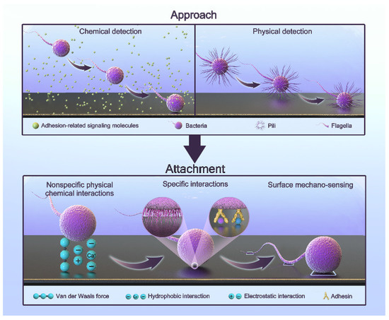 Approach refers to the proximity to a surface. Bacteria can approach surfaces via passive or active movement. The flow in bulk liquid, Brownian motion, and gravitational forces generate passive movement [47,48]. The active movement of bacteria involves swimming toward a surface through their flagella [49,50,51]. In bulk liquids, bacteria can move freely due to the bacterial load, but the flow and shear rates significantly affect this process [52]. In the vicinity of a surface, active movement plays a major role. By physically and chemically detecting the presence of a surface, bacteria can find the right direction [44]. Chemical detection includes sensing the concentration of hydrogen ions, antibacterial agents, and some biological signaling molecules [44]. In this way, bacteria can move toward surfaces with a specific nature. Physical detection includes receiving physical signals with the fimbriae or flagella and obtaining information through signal transduction [53]. When flagellar rotation is impeded, bacteria can also perceive a surface [53]. The deformation of the cell membrane caused by a surface also leads to the transmission of signals [46,54,55,56]. As a result, bacteria can swim toward the surface.