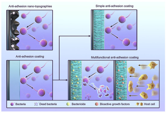 The effect of using the above anti-adhesion coatings alone is limited, and achieving the ideal antibacterial effect is difficult. Anti-adhesion coatings are often used in combination with systemic antibiotics [150]. To improve their performance, researchers have chosen to functionalize them further. Some studies have demonstrated that being loaded with antimicrobial peptides, antibiotics, bactericidal agents, or some metal ions can enhance their antibacterial properties [119,157,158]. Researchers previously grafted an antimicrobial peptide, Magainin I (Mag), to a titanium oxide surface [159]. PEG was also used to decrease adhesion. The adhesion of proteins and bacteria was considerably reduced in this coating. Due to this special coating, adherent bacteria grew slowly [159].