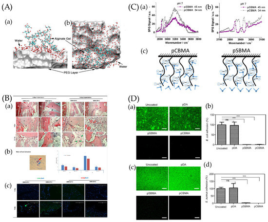 (A) Snapshot of a hydration water layer and alginate gel near a PEG coating: (a) side view and (b) top view. The PEG coating is represented by a van der Waals surface for clarity. Ref. [151] Reprinted with permission from Xiang et al. Copyright© 2016 American Chemical Society. (B) The resulting blocks contained 0, 20, 40, or 60 mg of PEG per gram of demineralized bone matrix (DBM) and were called DBMP-GP-0, DBM-GP-1, DBM-GP-2, and DBM-GP-3, respectively. Early-phase tissue reactions to PEG-cross-linked-gelatin-coated DBM. (a) DBM-GP-0 and DBM-GP-3 were explanted at days 1 and 3 postsurgery and H&E stained. D, DBM; M, muscle; gel, PEG cross-linked gelatin; mag, 10× and 40×. (b) Left, a representative image of mast cells (blue arrow) and their activation (red arrow); right, quantitative number of total and activated mast cells were measured at 1 and 3 days between DBM-GP-0 and DBM-GP-3. (c) IHC staining of CD80+ and CD163+ cells on explants. Scale bar = 100 μm [129]. Reprinted with permission from Bo et al. Copyright © 2020 American Chemical Society. (C) (a) Sum frequency generation (SFG) spectra collected from poly-(carboxybetaine methacrylate) (pCBMA)/water (pH~7) and poly-(sulfobetaine methacrylate) (pSBMA)/water (pH~7) interfaces. (b) Enlarged SFG spectra collected from pCBMA/water (pH~7) and pSBMA/water (pH~7) interfaces in the C−H stretching frequency region. (c) Scheme showing water molecules on two zwitterionic polymer surfaces [152]. Reprinted with permission from Xiaofeng et al. Copyright © 2019 American Chemical Society. (D) Antibacterial effect of pSBMA- and pCBMA-grafted Ti/TiO2 substrates against E. coli and S. aureus. Uncoated and polydopamine (pDA)-coated substrates were used as controls. (a,c) Representative fluorescence images and (b,d) quantification of E. coli and S. aureus cells adhering to surfaces after incubation for 6 h as determined by the SYTO 9/PI stain. The scale bars represent 200 μm. Each value represents the average and standard deviation of three different locations on three replicate samples. The fluorescence intensity of each sample was calculated as the percentage of the uncoated substrate. Statistical analysis was carried out using GraphPad Prism version 5. Each substrate was compared with the uncoated control using the unpaired Student’s t test (*** p < 0.0001, ns: not significant (p > 0.05)) [153]. Reprinted with permission from Yohan et al. Copyright © 2022 American Chemical Society.