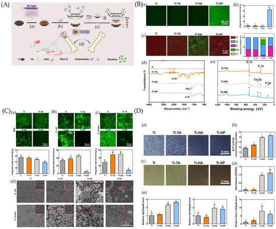 (A) Preparation and biological function of Ti-HP. (a) Tannic acid (TA) is deposited and polymerized on a Ti surface under UV irradiation. (b) A hydroxyapatite (HA) layer adheres to the TA layer and endows coating with osteogenesis ability. (c) The outermost PEG layer clinging to the superimposed TA layer enables the coating to inhibit bacterial adhesions. (d) The Ti-HP rod promotes osseointegration in a rat model. (B) Chemical characterization and surface wettability of coatings. (a) Fluorescence micrographs and (b) the corresponding integrated optical density (IOD) values of samples before and after being coated by polyethylene glycolated isothiocyanate (PEG-FITC). (c) The element mappings (Ti, O, C, Ca, and P) and quantified element analysis (O, C, Ca, and P) of the corresponding areas of Ti, Ti-TA, Ti-HA, and Ti-HP. (d) Attenuated Total Reflection–Fourier Transform Infrared Spectroscopy (ATR-FTIR) spectra of Ti, Ti-TA, Ti-HA, and Ti-HP. (e) X-ray photoelectron spectrometer (XPS) survey of the different steps in the preparation process. Dissimilar letters (x, y, z, and w) indicate values that are significantly different from each other’s group (p < 0.05). (C) Comparison of anti-adhesion properties among Ti, Ti-TA, Ti-HA, and Ti-HP. The fluorescence micrograph and the corresponding IOD values of (a) bovine serum albumin (BSA), (b) Escherichia coli (E. coli), and (c) Staphylococcus aureus (S. aureus) on surfaces after 24 h incubation. (d) Scanning electron microscopy (SEM) images of bacteria on samples incubated for 24 h. Dissimilar letters (x, y, z, and w) indicate values that are significantly different from each other’s group (p < 0.05). (D) Osteogenic differentiation of BMSCs on Ti, Ti-TA, Ti-HA, and Ti-HP. (a,b) Alkaline phosphatase (ALP) staining and quantitative analysis of bone marrow stromal cells (BMSCs) on samples after a 7-day osteogenic induction. (c) Alizarin Red S staining and (d) quantitative analysis among samples after a 14-day osteogenic induction. (e) mRNA expression levels of Alp, Ocn, and Runx2 determined by qRT-PCR. Dissimilar letters (x, y, z, and w) indicate values that are significantly different from each other’s group (p < 0.05). Ref. [163] Reprinted with permission from Yifang et al. Copyright © 2022 American Chemical Society.