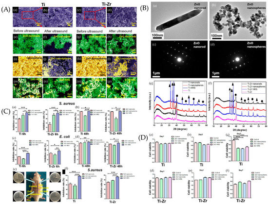 (A) SEM images of samples. SEM images of Ti and Ti−Zr slices were observed after sand blasting (a,c), where panels (b,d) are larger views of the red areas in panels (a,c). SEM images of ZnO nanorods on the surfaces of Ti slices (e,f) and Ti−Zr slices (g,h) were studied before and after ultrasound. SEM images of ZnO nanospheres on the surfaces of Ti slices (i,j) and Ti−Zr slices (k,l) were studied before and after ultrasound. SEM images of ZnO NRS on the surfaces of Ti slices (m,n) and Ti−Zr slices (o,p) were observed before and after ultrasound. (B) Transmission electron microscopy (TEM) and selected area electron diffraction (SAED) diffraction patterns of samples. TEM and SAED diffraction patterns of two different ZnO samples, (a,c) ZnO nanorods, and (b,d) ZnO nanospheres. X-ray diffraction (XRD) spectra of the Ti and Ti−Zr substrates coated with three different ZnO nanostructures (e,f) (▲ represents ZnO, and ● represents Ti). (C) Antibacterial effect of different ZnO samples against S. aureus and E. coli under different incubation times in vitro. ZnO samples cocultured with bacteria for 6 h (a,c) and 24 h (b,d). (e) Diagram of SD rats 2 weeks after implant surgery. Four respective plate colony counting photos are provided to show the amount of bacteria on the surfaces of implants. (f) Antibacterial capability of the different ZnO coatings on implant surfaces (Ti or Ti−Zr) against S. aureus 2 weeks after surgery. * p > 0.05, ** 0.01 < p < 0.05, and *** 0.001 < p < 0.01. (D) Cell viability of the human fibroblasts. The cell viability of the human fibroblasts in Ti (a–c) and Ti−Zr (d–f) groups after 1, 3, and 7 days of cell culture with leaching liquor of different samples is shown. *** 0.001 < p < 0.01). Ref. [180] Reprinted with permission from Xiaheng et al. Copyright © 2020 American Chemical Society.