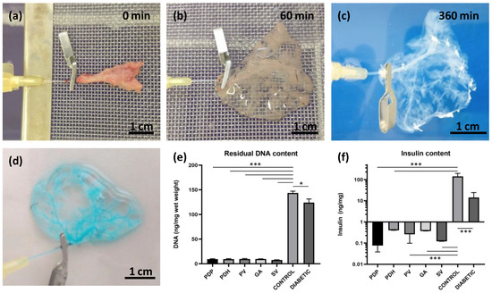 Pancreatic decellularization procedure and assessments. (a–c) Representative images illustrate the gradual change in color during the perfusion decellularization of the pancreatic tail, via splenic vein (a) at the beginning, (b) after 60 min, and (c) at the end of the decellularization process (360 min); (d) the intact vasculature in the decellularized pancreases was evaluated by infusing a patent blue solution, and detecting any leakage; (e) DNA quantification; decellularized pancreases contained significantly lower amounts of double-stranded DNA compared to intact healthy control and diabetic pancreases; (f) insulin quantification; decellularized and diabetic pancreases contained significantly lower insulin contents compared to control healthy pancreases; perfusion approaches: PDP—pancreatic duct via papilla, PDH—pancreatic duct from hepatic side, PV—portal vein, GA—gastric artery, SV—splenic vein; * p < 0.05 and *** p < 0.001.