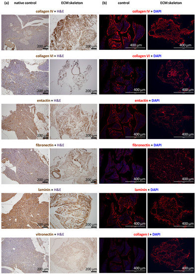 Representative images of the structural proteins in native and decellularized pancreases perfused via the splenic vein. (a) Immunohistological images show the identification of selected proteins, including vitronectin, in the control pancreas (left) and the pancreatic skeleton (right), stained with specific antibodies and visualized with the DAB detection system; (b) immunofluorescence images show the identification of selected proteins, including collagen I, in the control pancreas (left) and the pancreatic skeleton (right), stained with specific fluorescent antibodies (red); sections were counterstained with DAPI (blue) for detection cell nuclei.