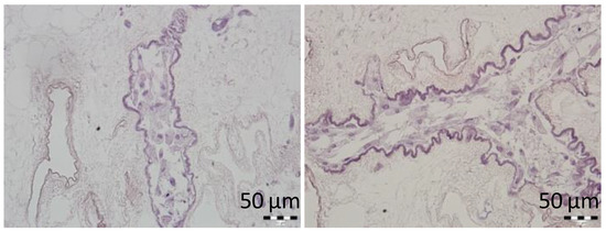 The ECM skeletons cytocompatibility was tested via dynamic cultivation of mesenchymal stem cells (MSCs) in the ECM skeletons (n = 3). The MSCs were isolated from retroperitoneal and epididymal fat from Lewis rats according to our standard protocol. Briefly, tissues were digested by collagenase solution (1 mg/mL; Merck, Darmstadt, Germany), and MSCs were then separated on Ficoll-Paque (1.077 g/mL; GE Healthcare Bio-Sciences AB, Uppsala, Sweden). Isolated MSCs were incubated in DMEM medium supplemented with 10% FBS, 5% HEPES, 1% penicillin–streptomycin, 1% GlutaMAX, 1% insulin–transferin–selenium (all chemicals from Merck, Darmstadt, Germany), and 50 ng/mL EGF (epidermal growth factor; R&D Systems, Minneapolis, MN, USA) in a humidified incubator at 37 °C and 5% CO2 atmosphere until passage 6. The MSCs were analyzed by flow cytometry (BD LSR II) with the FlowJo software (both from BD Biosciences, Franklin Lakes, NJ, USA) as CD29-, CD90-, and CD105-positive and simultaneously CD45-negative cells. MSCs were stained with endoglin/CD105 biotinylated antibody (BAF1320, R&D Systems, Minneapolis, MN, USA), APC anti-mouse/rat CD29 antibody (BioLegend, San Diego, CA, USA), PE-Cy™5 mouse/anti-rat CD45RA antibody (BD Bioscience, Franklin Lakes, NJ, USA), and FITC anti-rat/mouse CD90.1 (Thy-1.1) [HIS51] antibody (eBioscience, San Diego, CA, USA), which were detected with Qdot 605 streptavidin conjugate (Invitrogen, Waltham, MA, USA). Five million MSCs were injected into the ECM skeletons through cannula in SV. After stationary culture for 1 h, the ECM skeletons were connected to the perfusion system, consisting of a peristaltic pump, tubes, and a chamber, with a flow rate of 1.8 mL/min. Dynamic culture was performed for 3 days, after which the ECM skeletons with MSCs were stained with H&E.