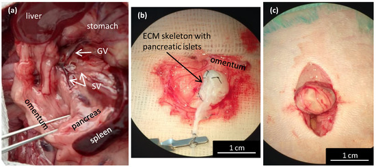 Wrapping the repopulated pancreatic skeleton in omentum for transplantation. (a) Illustrative image of the anatomic location of the splenic veins for the decellularization perfusion; GV—gastric vein, SV—splenic vein; (b) the ECM skeleton is placed on the extruded omentum; ECM—extracellular matrix; (c) the ECM skeleton is packaged in the omentum, and the wrapping is secured with a single stitch.
