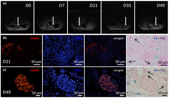 Time course of iron-oxide-labeled pancreatic islets within transplanted ECM skeletons. (a) Representative MR images show the ECM skeleton (arrows), which contained pancreatic islets, transplanted into the greater omentum in a rat model over a period of 7 weeks; (b) representative fluorescent images of iron-oxide-labeled islets in ECM skeletons, 21 days after transplantation into the omentum; (left) insulin-positive cells (red) in the graft; (middle left) DAPI counterstaining (blue) indicates cell nuclei; (middle right) merged image shows insulin in cells with intact nuclei; (right) histological examination of iron deposits (blue stain and arrows), mostly detected in tissue surrounding the pancreatic islets; (c) representative fluorescent images of iron-oxide-labeled islets in ECM skeletons, 49 days after transplantation into the omentum; (left) insulin-positive cells (red) in the graft; (middle left) DAPI counterstaining (blue) indicates cell nuclei; (middle right) merged image shows insulin in cells with intact nuclei; (right) histological examination of iron deposits (blue stain and arrows), mostly detected in tissue surrounding the pancreatic islets.
