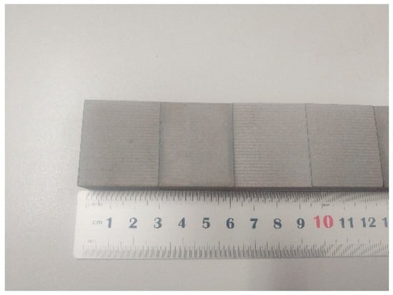After the machining is finished, the test piece is cut into 15 mm × 10 mm × 6 mm test pieces by using the electric spark numerical control cutting machine, so that it can be conveniently fixed on the workbench of the friction and wear testing machine. The machine tool for cutting the test pieces is the electric spark numerical control led by a microcomputer produced by Zhengtai Numerical Control Machine Tool Co., Ltd. (Shenzhen, China). The model is DK7735, and the maximum processing range is 450 mm × 350 mm. In order to prevent the milled surface from being oxidized or corroded in the process of wire electrical discharge machining, a layer of insulating adhesive tape is pasted on the milled surface, and after the cutting is completed, the adhesive tape is removed. To prevent impurities from remaining on the milled surface, place the cut sample in the acetone for ultrasonic cleaning for 10 min. After cleaning, take it out with tweezers, and blow it dry in the same direction with a blower. To prevent impurities from sticking on the milled surface, place the sample in absolute ethanol for ultrasonic cleaning for 5 min; then take it out with tweezers and blow it dry in the same direction with a hair dryer. The finished test piece is shown in Figure 1, with a size of 35 mm × 30 mm × 15 mm, and then each test piece is marked. In order to locate the workpiece better and eliminate the interference of other factors, draw a straight line 15 mm from the bottom edge, which plays a positioning role when clamping the workpiece. An X-ray diffractometer was used to analyze the phase composition of the machined surface. The instrument model was Bruker D8 Advance, the scanning speed was 2°/min, and the scanning range was 20–90. After the test, four groups of data were exported and compared.