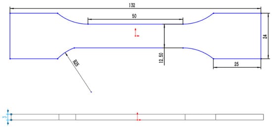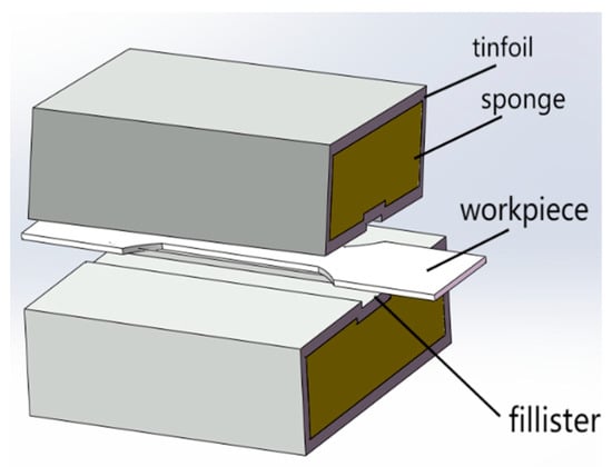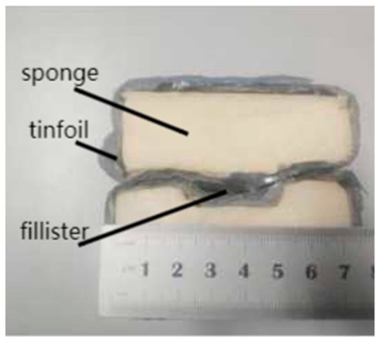 The tensile test was carried out on an electronic universal testing machine. The model of the testing machine is CMT610, and the test tensile speed is 4 mm/min. The tensile test pieces are processed by wire cutting, and is designed and processed according to the size requirements of the national standard GB/T228.3-2019 Metallic Materials–Low Temperature Test Method. The size of the test pieces are shown in Figure 2, and the gauge distance is designed to be 50 mm. As the electronic universal testing machine itself does not have the heat preservation function, it needs a heat preservation device to ensure that the test pieces keep a certain temperature during stretching, so the heat preservation device shown in Figure 3 is designed. The thermal insulation device is divided into two symmetrical parts, the inside is sponge, the outside is tinfoil, and a groove is reserved in the middle to hold the workpiece. Figure 4 shows the relative position of the specimen and the thermal insulation device.