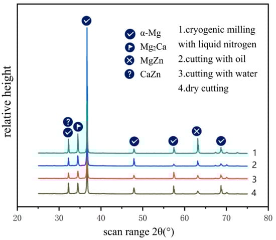 It can be seen from the observation that the machined surfaces under different cooling conditions are mainly an α-Mg phase and some second phases. After different cooling methods, no new phases appear on the surfaces. The crystallinity of the second phases on the dry and low-temperature machined surfaces is better than that on other machined surfaces, and the number of second phases on the low-temperature machined surfaces is higher than that on other surfaces. The analysis is that liquid nitrogen is sprayed in the cutting area as cutting fluid. A good cooling effect was achieved, and the temperature in the contact area of the chips was reduced. The contents of Ca and Zn exceeded the maximum solubility due to the temperature reduction, and the precipitated Ca and Zn formed the second phase with the Mg matrix. According to Liu’s research [31], with the increase in the second phase, when a large number of second phases are used as cathode phase and magnesium matrix phase to form a corrosive microbattery, the dissolution rate of the magnesium matrix phase is obviously accelerated. However, when the content of the second phase continues to increase to the extent that it can be connected to form a network distribution, and the fine magnesium matrix phase is included in the network second phase at this time, the corrosion propagation rate of the magnesium matrix phase will be significantly reduced, and the corrosion products will also inhibit the continuous corrosion of the matrix phase crystals, thus improving the corrosion resistance of the alloy. Therefore, cryogenic milling contributes to the formation of the second phase, and when enough second phase is formed, it can play a corrosion-resistant role.