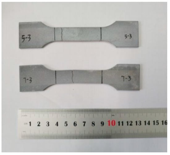 After the tensile test, take off the fracture of the tensile test pieces and observe its fracture morphology. The instrument used is a scanning electron microscope produced by FEI Company of the United States, and its model is Quanta 250 FEG. Then, the metallographic structure of the fracture was observed, and the fracture of the tensile test pieces was taken down for cold inlay, grinding, and polishing. The polished surface was gently wiped with a nitric acid alcohol corrosive solution with 4% solubility, then quickly washed with distilled water and dried in the same direction. The metallographic structure of the fracture of the tensile test pieces was observed using a 4XC metallographic microscope produced by Shanghai Optical Instrument No. 1 Factory.