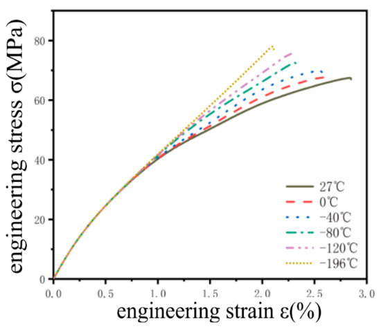 The low-temperature tensile test was designed at seven temperatures, namely, 27 °C, 0 °C, −40 °C, −80 °C, −120 °C, −160 °C, and −196 °C, and the test was repeated three times at each temperature. Before the test, pour absolute ethanol into the cooling barrel, and then pour a small amount of liquid nitrogen to form a mixed solution. Measure the temperature of the mixed solution with a digital thermometer, and add liquid nitrogen to make the mixed solution reach the expected temperature. After that, soak the test pieces in the mixed solution for 15 min. During this period, observe the digital thermometer, and maintain the temperature of the mixed solution by continuously adding liquid nitrogen. Finally, the three test pieces are directly immersed in a liquid nitrogen tank (liquid nitrogen tank is filled with liquid nitrogen at −196 °C) for 15 min; then the test pieces are taken out, quickly stuffed into a heat preservation device, and stretched on a universal testing machine. After the test is completed, the data are exported. During the test, it was found that the mixed solution of alcohol and liquid nitrogen had solidified at −160 °C, and the test pieces could not be taken out, so the tensile test at this temperature could not be carried out. Therefore, only six groups of tensile data were actually obtained.