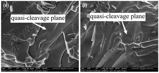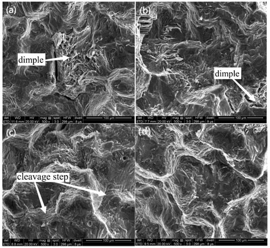 Take off the fracture of tensile test pieces and observe its fracture morphology. By observing the electron microscope with a magnification of 500 times, it is found that there are a lot of cleavage steps and quasi-cleavage planes at the fracture. In the scanning electron microscope (SEM) images at 27 °C and 0 °C, dimples were observed, but no dimples were found at other temperatures, as shown in Figure 8 and Figure 9. The appearance of dimples makes the material have better plasticity and higher elongation [33], which can also explain why the elongation of the material decreases with the decrease in temperature.