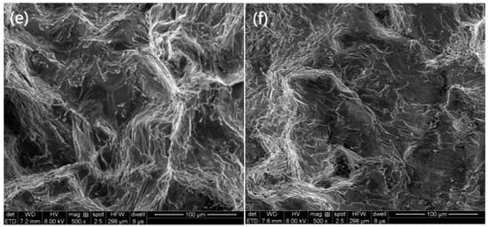 Scanning electron microscopy of the tensile fracture of magnesium alloy (500×): (a) 27 °C, (b) 0 °C, (c) −40 °C, (d) −80 °C, (e) −120 °C, (f) −196 °C.