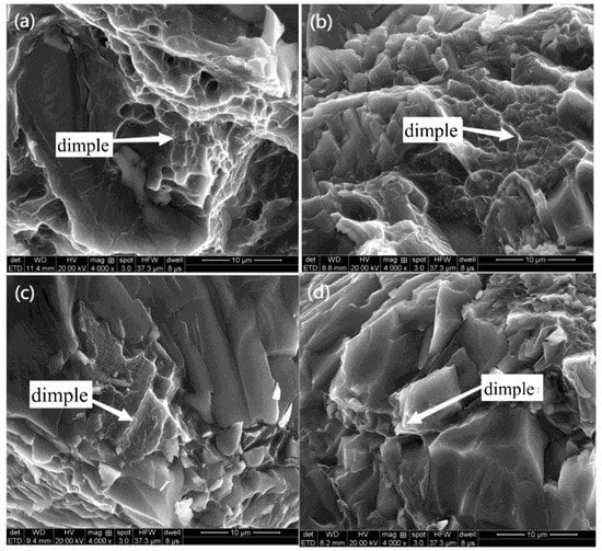 With the decrease in tensile temperature, the number of dimples decreases, and the dimple area becomes smaller and smaller. Some crystals have small planes stretching in different directions, which are cleavage planes formed by cracks propagating along different twin planes. Cleavage cracks generally occur on the most densely packed plane of atoms. Cleavage cracks meet with dislocations to form cleavage steps during their propagation, and their direction is usually the same as the crack propagation direction. A large number of such cracks continue to expand and connect, which eventually leads to the fracture failure of the alloy. At low temperatures, such as −120 °C and −196 °C, there are basically no dimples in the fracture surface, but a large number of cleavage planes appear. The appearance of these cleavage planes speeds up the crack propagation in the crystal, and the fracture mode has shown a cleavage fracture mechanism at this time. Cleavage planes in different directions are still connected with each other by tearing ridges extending in all directions. Because the orientation of each crystal is different, the cracks propagate along different planes, and many cleavage steps with different sizes are formed at the intersection of each cleavage plane. With the further aggravation of deformation, the cracks rapidly propagate along these cleavage planes and lead to the final fracture, which shows that the fracture mode of magnesium alloy is a quasi-cleavage fracture, which is consistent with the research conclusion of Guo [34]. It can be seen from the above-mentioned SEM images of fracture morphology that with the decrease in temperature, the dimple area decreases, which indicates that the brittleness of magnesium alloy increases with the decrease in temperature, which explains why the elongation of magnesium alloy decreases with the decrease in temperature in the low-temperature tensile test.