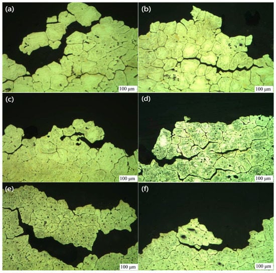 Metallographic diagram of the tensile section of magnesium alloy (100×): (a) 27 °C, (b) 0 °C, (c) −40 °C, (d) −80 °C, (e) −120 °C, (f) −196 °C.