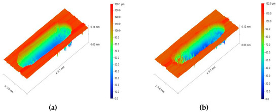 Because oil-based cutting fluid and water-based cutting fluid are not conducive to the formation of the second phase and cannot have the effect of corrosion resistance, the friction and wear test only compares dry cutting and cryogenic milling. During the friction and wear test, the sensor will measure the friction coefficient between the counter-grinding ball and the sample in real time, and the friction and wear process can be divided into running-in stage and stable wear stage. After the friction and wear test, the change trend of the friction coefficient with time can be derived by computer processing, as shown in Figure 11. The average friction coefficient of the milled surface can be calculated by the software equipped with the friction and wear testing machine, and then the wear morphology of the milled surface can be observed by the white light interferometer, and the wear volume can be calculated. The average friction coefficient and wear volume are shown in Table 6, and the wear morphology of the dry cutting and cryogenic milling surfaces is shown in Figure 12. The displayed value is the relative height value from the lowest wear position to the milled surface, that is, the wear depth value. Fr om the analysis results in Table 6, it can be seen that the average friction coefficient of the low-temperature machined surface is lower than that of the dry-cut machined surface, and the amount of wear is smaller. The analysis reason is that the roughness of the dry-cut machined surface is large, and the residual area of the machined surface increases, resulting in an uneven machined surface, which increases the friction coefficient. In the cooling environment of liquid nitrogen, because liquid nitrogen plays the role of lubrication and cooling, the dislocation slip of crystals becomes difficult at low temperature, resulting in high hardness of the cryogenic milling surface. In the process of friction and wear, the average friction coefficient decreases by about 7.4% compared with dry cutting, and the wear amount decreases by about 10%. From Figure 12, it can be observed that the wear depth of the dry milled surface is 0.14 mm, that of the cryogenic milling surface is 0.12 mm, and that of the wear depth of the dry milled surface is larger, indicating that the wear resistance of the dry milled surface is worse than that of the cryogenic milling surface, which is consistent with the above conclusion of analyzing the average friction coefficient and wear volume. The average friction coefficient of the cryogenic milling surface is lower, the wear amount is smaller, and the wear resistance is better. There are two main reasons: First, because the temperature decreases in the liquid nitrogen cooling environment, the dislocation slip of grains becomes difficult, and the surface hardness increases. Second, the addition of zinc and calcium can improve the hardness of the material after grain refinement [37].