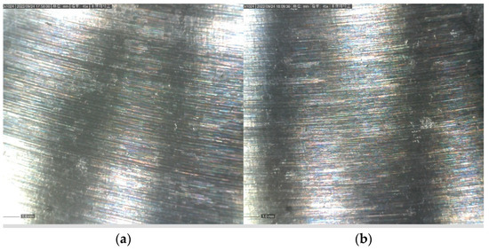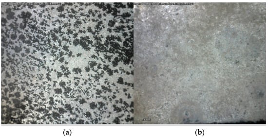 Similar to the friction and wear test, the corrosion test only compares dry cutting and cryogenic milling, and the microscopic photos before electrochemistry are shown in Figure 13. Using a handheld microscope to observe the corroded surface, it can be seen that after electrochemical corrosion, the surface of the cutting surface turns black from white metallic luster, as shown in Figure 14. According to the first section of the third chapter, it can be known that the second phase appears in magnesium alloy, and the formed second phase can be used as cathode point-to-point accelerated corrosion [38], causing galvanic corrosion of the matrix, so pitting pits mainly appear around the grain boundary of the second phase. The magnesium matrix combines with chloride ions in a corrosive medium to form soluble magnesium chloride, which is fixed on the surface of the alloy matrix to form a circular pit. With the prolongation of the corrosion time, the pit becomes bigger and bigger, and at this time, galvanic corrosion becomes local corrosion. With the prolongation of the corrosion time, the second-phase compound will gradually fall off and lose its protective effect on the alloy matrix.