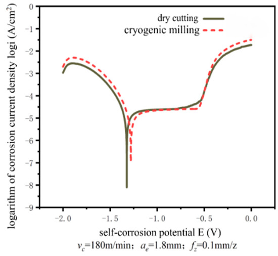 In the process of the electrochemical corrosion test, the polarization curve can be observed in real time by the equipped software, and the corresponding test data can be recorded. After the electrochemical test, the self-corrosion potential can be checked by the software. The quotient of corrosion current and corrosion surface area is corrosion current density, and the corrosion resistance of the milled surface can be judged according to the corrosion current density and self-corrosion potential. The polarization curves of the dry milled surface and cryogenic milling surface obtained by processing the test data are shown in Figure 15. Table 7 shows the self-corrosion potential and corrosion current density of machined surfaces under different cooling conditions. As shown in the figure, compared with the surface machined by dry cutting, the surface machined by cryogenic milling has higher self-corrosion potential and lower corrosion current density, indicating that the corrosion resistance of the surface machined by cryogenic milling is better than that of the surface machined by dry cutting. Combined with the research results in Chapter 3, it is analyzed that the poor corrosion resistance of the dry milled surface is due to the high roughness of the dry milled surface and more metal residues on the surface, resulting in an uneven distribution of the oxide film formed by machining. In this case, corrosion reaction is more likely to occur, so the self-corrosion potential of the dry milled surface is low, and the corrosion current density is high. However, the surface roughness of cryogenic milling is low, the oxide film formed is relatively dense and uniform, and the refinement degree of the surface crystal after cutting is better than that of dry cutting, so the corrosion resistance of the cryogenic milling surface is better. There are two main reasons: First, with the increase in the content of the second phase, when it can be connected to form a network distribution, the fine magnesium matrix phase is included in the network second phase at this time, so the corrosion propagation rate of the magnesium matrix phase will be significantly reduced. Second, because corrosion products can also inhibit the continuous corrosion of matrix phase grains, the surface roughness of low-temperature cutting is low, the oxide film formed is relatively dense and uniform, and the refinement degree of surface grains after cutting is better than that during dry cutting, so the corrosion resistance of the low-temperature cutting surface is better.