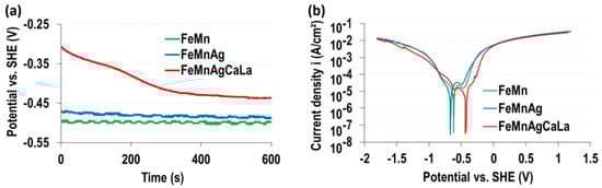 The initial OCP values during the first 10 min of immersion (Figure 1a) show a more anodic corrosion potential for the FeMnAgCaLa alloy in comparison to the FeMn and FeMnAg alloy substrates. This result corresponded well with the corresponding LSV data showing that that the anodic dissolution rate is reduced for the FeMnAgCaLa alloy in comparison to the two other alloys.