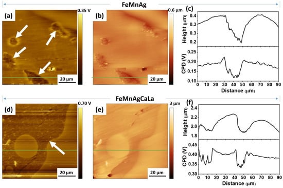 SKPFM results of FeMnAg and FeMnAgCaLa obtained from a 90 μm × 90 μm area: (a,d) topography, (b,e) corresponding contact potential differences, (c,f) corresponding cross-section (green line) profiles.